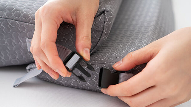 大小2つの枕パーツは、付属のアタッチメントで簡単に取り付けができます。ゴムの長さは調整でき、枕パーツの組み合わせによって発生するゴムのたるみや、つっぱりも長さを調整することでストレスなくご使用いただけます。
