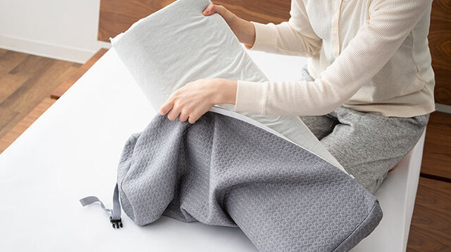 人は眠っている間に約コップ1杯分の汗をかくと言われています。OMAKURAは、清潔に眠れるよう、カバーは外して、ご家庭でお洗濯が可能です。また、中材の低反発ウレタンには、ニット生地のインナーカバーが巻かれているため、カバーの付け外しの際、滑りがよく簡単に取り付けができます。
